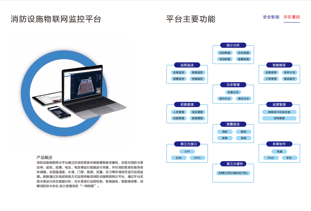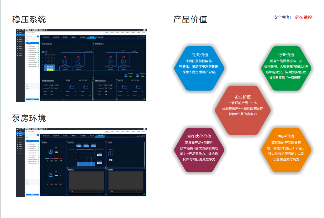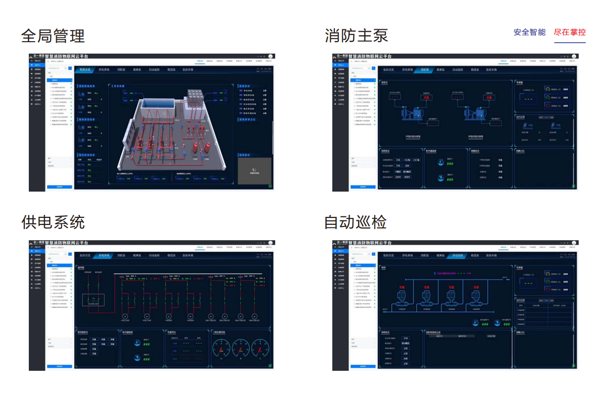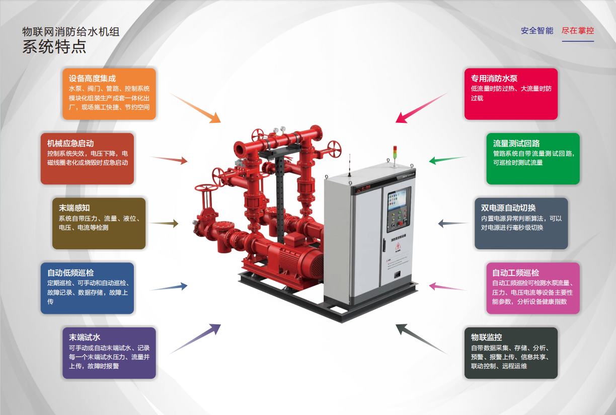 全一泵业集团的物联网消防给水成套机组是根据现行国家规范《消防给水及消火栓系统技术规范》GB50974-2014及相关物联网标准要求,开发出的一种智能化、数字化、集成化的消防给水产品。该产品涵盖了供水设备、电源、自动控制、人工控制、远程控制、低频自动巡检、工频自动巡检、机械应急启动、火灾联动、物联网云计算等关键环节,实现了消防给水系统的全方位智能化监控与管理。 具体而言,该机组具有以下特点: 1.智能化程度高:通过物联网技术,实现对消防给水系统的实时监控、数据分析、故障预警等功能,提高系统的运行效率和安全性。 2.数字化控制:采用先进的控制算法,对水泵的启动、停止、调速等进行精确控制,确保系统稳定运行。 3.集成化设计:将供水设备、电源、控制柜等集成于一体,减少了占地面积和安装难度,提高了施工效率。 4.多重安全保障:具备机械应急启动、过热保护、低频巡检等多项安全保障功能,确保系统在紧急情况下能够正常工作。